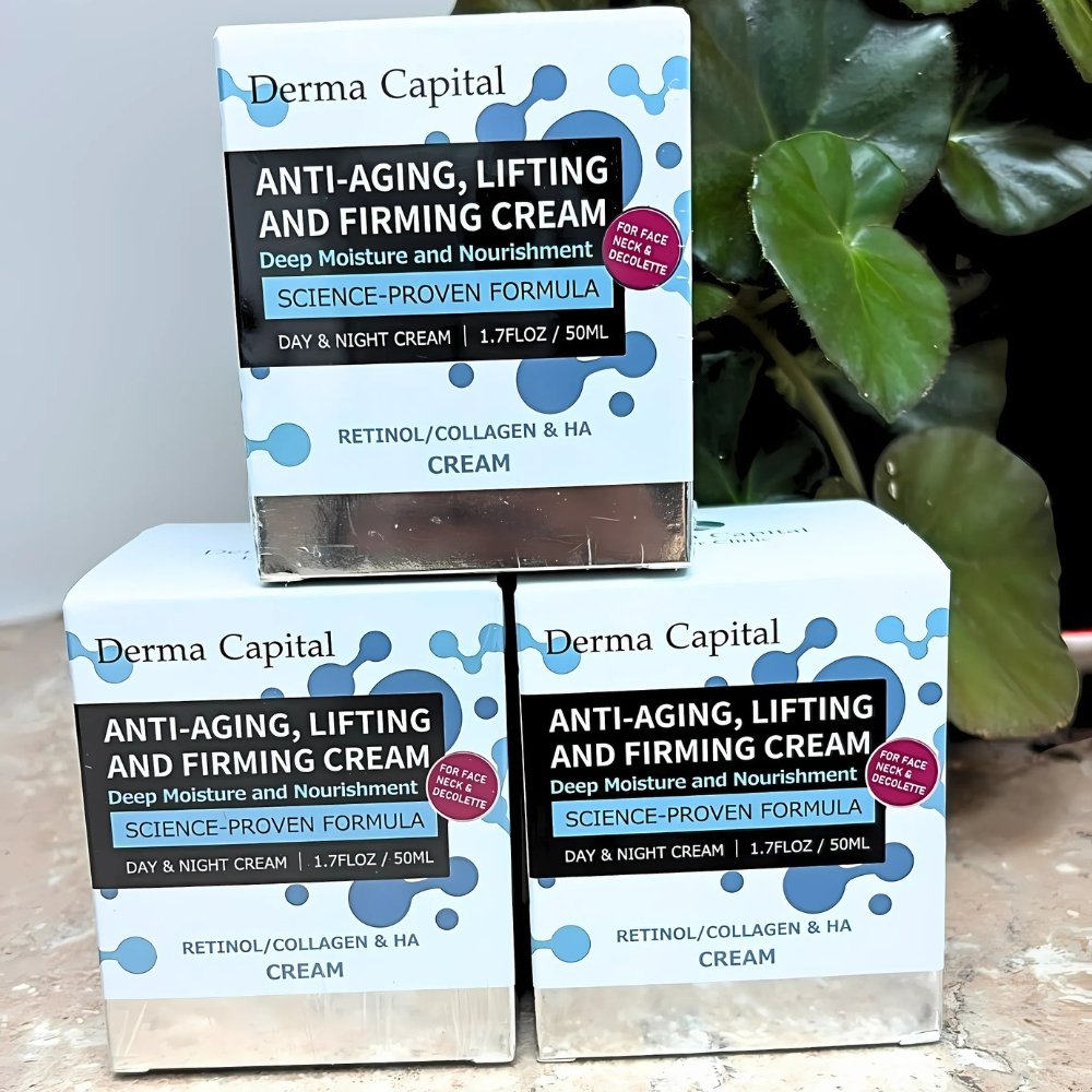 The Derma Capital Anti-Aging, Lifting & Firming Cream is designed to target visible signs of aging on the face, neck & décolleté. Its unique blend of Retinol, Collagen, and Hyaluronic Acid works together to provide deep hydration, boost elasticity, and restore youthful glow.